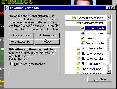 Umbennen und Löschen von Lesezeichen | Lesezeichen werden in der Regel unter dem Titel, den die Seite in der Kopfzeile trägt, abgelegt. Diesen Titel sieht man im obersten Balken des Browsers. Leider vergessen einige Webdesigner diese Titelzeile bei ihren Seiten oder geben ihnen Titel, die für eine sinnvolle Klassifizierung nicht brauchbar sind (denn wer weiß schon nach einem Monat noch, was sich hinter "Peters Seite" verbirgt). Um also "leere" oder unverständliche Einträge in den Lesezeichen zu bearbeiten, muss man zuweilen im Menü "Lesezeichen bearbeiten" bzw. "Favoriten verwalten" einen eigenen Titel für das Lesezeichen eingeben. Bei Netscape geschieht dies durch Öffnen des "Lesezeichen bearbeiten"-Menüs. In diesem Menü mit der rechten Maustaste auf das entsprechende Lesezeichen klicken und Lesezeicheneigenschaften wählen, um dem Zeichen einen Namen zu geben. In diesem Menü können auch Lesezeichenordner verschoben oder umbenannt werden. Beim Explorer gibt es im Favoritenverwaltungsmenü entsprechende Umbennungsfunktionen und Möglichkeiten, Favoritenordner zu verschieben. |  |