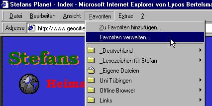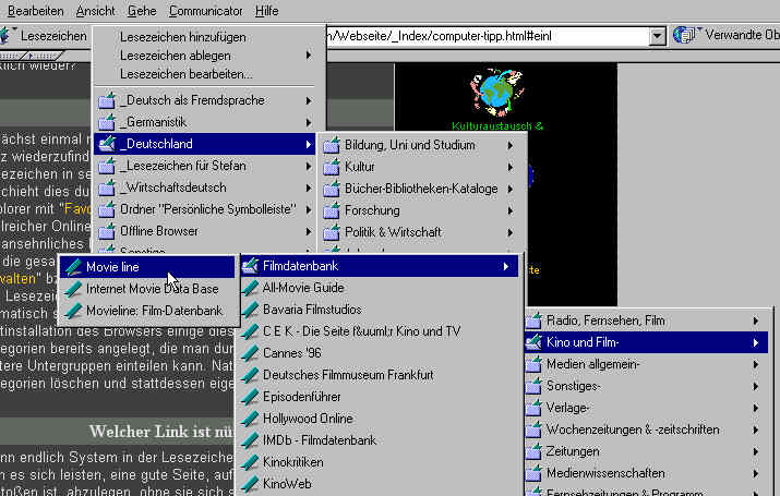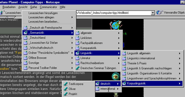 | Die richtige Verwaltung | Natürlich kann man sich alle wichtigen Netz-Adressen wie gewohnt in einem kleinen Büchlein notieren. Weniger Schreibarbeit beinhaltet jedoch die Speicherung als Lesezeichen bzw. Favoriten im Browser selber. Bei Netscape geschieht dies durch "Lesezeichen/Lesezeichen ablegen", beim Explorer mit "Favoriten/zu Favoriten hinzufügen". Im Laufe zahlreicher Online-Stunden wächst diese Lesezeichendatei auf ein ansehnliches Maß, so dass es bald an der Zeit ist, die gesammelten Lesezeichen zu ordnen. Über "Favoriten verwalten" bzw. "Lesezeichen bearbeiten" können Unterordner in den Lesezeichenordnern angelegt und somit die Lesezeichen thematisch sortiert werden. In der Regel werden bei der Erstinstallation des Browsers einige dieser allgemeinen Kategorien bereits angelegt, die man durch die Bearbeitung in weitere Untergruppen einteilen kann. Natürlich kann man auch Kategorien löschen und stattdessen eigene Ordner anlegen. |  |
