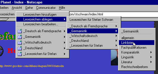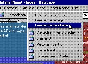 | Einleitung | Bibliophile Netznutzer mögen aus nostalgischen Gründen die "Lesezeichen"des Netscape Communicator den "Favoriten" des Internet-Explorer oder der "Hotlist" des weniger bekannten Browsers Opera vorziehen, auch wenn der inzwischen in der Netzsprache gebräuchliche englische Ausdruck für Lesezeichen, der "Bookmark" nur noch wenige Assoziationen zu dieser Reminiszenz an das Buch aufkommen läßt. Die Rede ist von Webseiten, deren Adresse ("URL") man sich merken will, um sie später schneller wiederzufinden. Doch wie findet man seine Lesezeichen in der großen "Bibliothek" des Internet später wirklich wieder? |  |