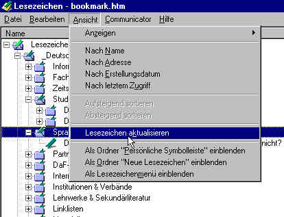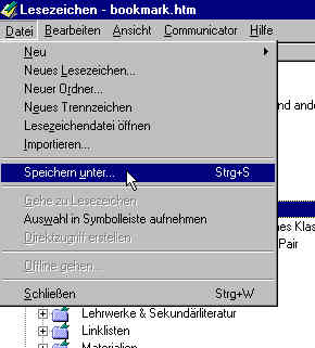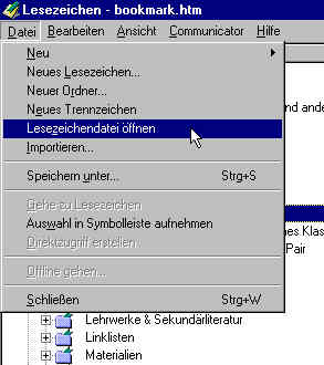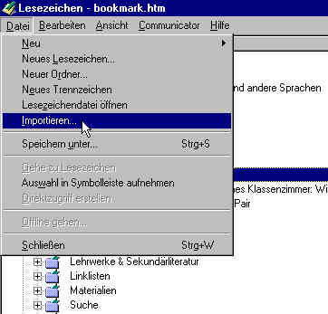| Import von Linklisten | | Wie bereits erwähnt lassen sich ganze Linklisten zu bestimmten Themen in die Netscape-Lesezeichendatei importieren. Bei Netscape geht das zuweilen völlig problemlos, indem man einfach die Linkseite auf der Festplatte speichert und dann in seinem Browser als Lesezeichendatei (nicht als Webseite!) öffnet. Manchmal ist eine unaufwenige Nachbearbeitung (Formatierungen entfernen) nötig. Das geht nicht immer, aber oft sind Linklisten einfache Netscape-Bookmarks, die als htm gespeichert worden sind und auch als solche wieder im Bearbeitungsmenü für die Lesezeichen geöffnet werden können. Achtet unbedingt darauf, vorher die Datei bookmark.htm im Netscape-Ordner sichern, um sich vor Lesezeichenverlust zu schützen! Ihr könnt ihr dazu einen neuen Namen geben, wie z.B. bookmark1.htm. Mit dieser Seite könnt ihr den Import ausprobieren! Die Seite speichern und unter "Datei/Lesezeichen öffnen..." bzw. "Lesezeichen importieren..." im Lesezeichenbearbeitungsmenü importieren. Recht gut funktioniert dies auch z.B. mit diesen DaF-Seiten:Hochschulen in D, Rakkaus, Holzinger (die Linkseiten müssen erst geöffnet werden, Sortierung per Hand), Kirst (aufwendigere Nachbearbeitung nötig).Für den MS-IExplorer 5.0 ist das Verfahren nur über den Import der Netscape-Lesezeichendatei möglich, mit älteren Versionen nur über Konvertierungsprogramme. |  |
