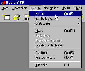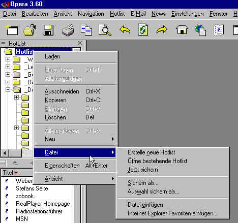 | Einige Worte zum Import in Opera | | Ab Version 3.6 können auch in den weniger gebräuchlichen Browser Opera Favoriten importiert werden. Leider funktioniert bisher nur der Import von Explorer-Favoriten und nicht von Netscape-Lesezeichen. Für eine der nächsten Versionen ist aber der Import von Netscape-Lesezeichen geplant. Um die Favoriten nach Opera zu importiren, muss die Hotlist geöffnet werden. Mit der rechten Maustaste auf den Ordner klicken, in den die Favoriten importiert werden sollen, und zum Registrierfeld "Datei/Internet Explorer Favoriten importieren" gehen. |  |